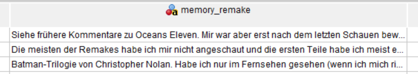 Ersteres hat bislang bei mir noch nicht funktioniert. Als einzige Alternative fällt mir noch ein, eine neue Variable zu erstellen, in der dann eben die Filmtitel, z.B. Oceans Eleven, einzeln stehen, sodass sie dann in einen neuen numerischen Wert umgewandelt werden können.