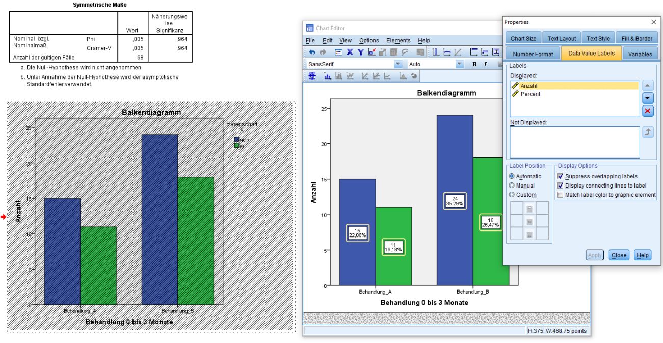 ich habe in SPSS eine Assoziationsanalyse über "Analyze - Descriptive Statistics - Crosstabs" durchgeführt und "Display clustered bar charts" aktiviert. Dies erzeugt ein gruppiertes Balkendiagramm mit den absoluten Häufigkeiten. In der Ergebnis-Ausgabe wird mir neben dem Diagramm auch eine Kreuztabelle mit den absoluten Häufigkeitswerten angezeigt ebenso wie prozentuale Häufigkeitswerte innerhalb der Gruppen. Ich habe die ins Excel-Format exportierte Ausgabe-Datei hier angehängt, da dies dann deutlicher wird, was ich meine. In dieser Datei sind die absoluten Häufigkeitswerte orange hervorgehoben. Bei beiden Variablen handelt es sich um nominale Variablen mit jeweils zwei Stufen/Ausprägungen (Leveln).