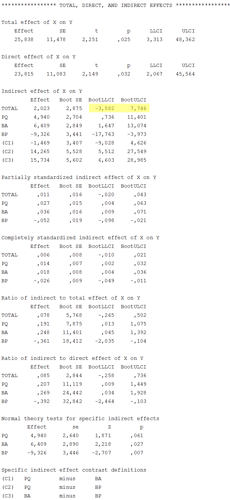 Für die zweite abhängige Variable allerdings wird der indirekte Effekt des Gesamtmodells nicht signifikant. Siehe den Output in der anghängten Datei. Muss ich dann meine gesamte Mediation ablehnen, also liegt gar keine Mediation vor? Wie kann ich dieses Ergebnis korrekt analysiseren?