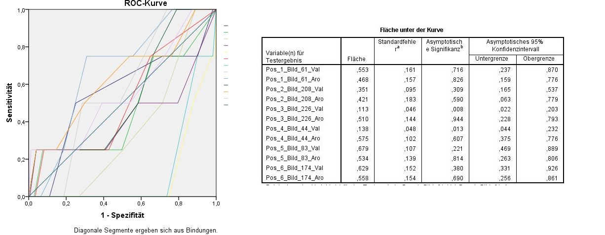 Ich habe Bilder raten lassen anhand von zwei Dimensionen, sodass ich zu jedem Bild zwei Werte habe. Zudem habe ich zwei Gruppen (hoch/niedrig). Nun möchte ich für einen Teil der Bilder (die "statistisch besten" sozusagen ^^) mir die Sensitivität und Spezifität ausgeben lassen. Wenn ich das mache, bekomme ich aber viel zu viele Kurven (klar, für jede Dimensionsbewertung einzeln). Damit kann ich aber irgendwie nichts anfangen.. Bin ich überhaupt richtig vorgegangen?